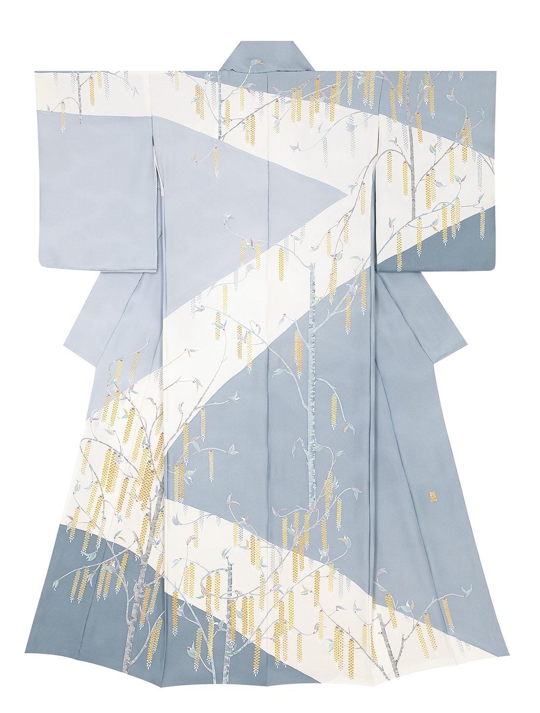 地を曲線で大胆に区切って染め分け、まっすぐな幹から曲がりくねった枝を伸ばすキブシを友禅染で描く。江戸時代前期の小袖意匠を現代風に翻案したかのようなその図案の構成力は巧みで、友禅染の技術も極めて丁寧である。地色とキブシの花の色の対比も美しい。地色も花の色も微妙な変化をつけており、隅々まで配慮のいきわたった優品である。(澤田和人)