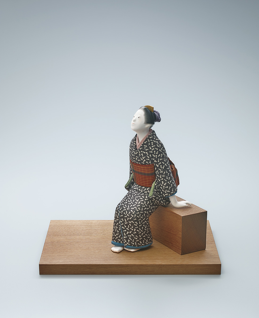 - 受賞総評日本髪の粋な着物姿の女性が空を眺めている。「鰯雲」は、俳句「寄りそって 行こうと思う いわし雲」から想を得た作品で、作者のこれから頑張ろうとの思いを人形に託した。技法は、木彫に桐塑で素地を作り、衣裳を着せて木目込、胡粉、彩色で仕上げている。江戸の風俗、下町の情緒、飄逸な表情などに作者独自の視点が見られ、日本女性の情感が溢れている。(内田篤呉)