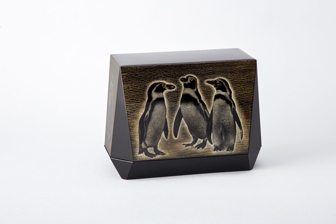 - 受賞総評漆黒の地に対照的な沈金で点彫りの粗密と巧妙さを活用して、水族館のフンボルトペンギンを写実的に表している。ただ、プリズム様の箱の外面や内箱に描写されたペンギンはどこか抑制された表情で、いうならそれぞれが遠くに思いを馳せているものか。作家が、故郷・能登の復興に思いを巡らせ、離れて暮らす自らの望郷の念を主題に重ねたのかもしれない。(諸山 正則)